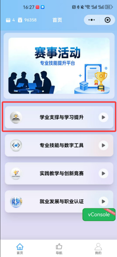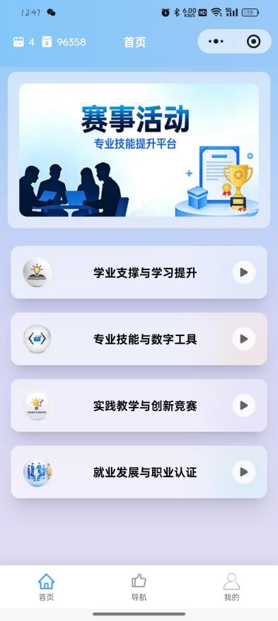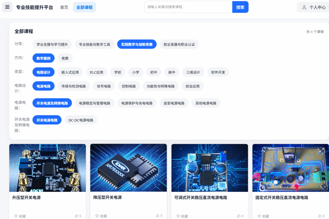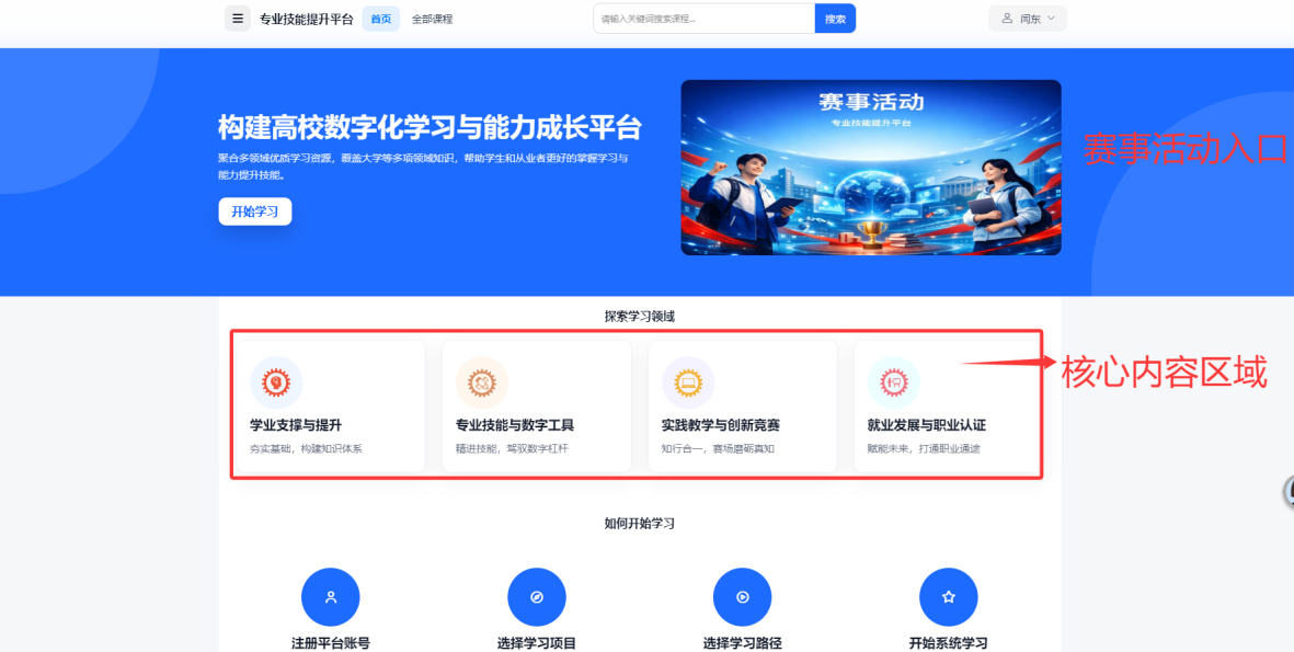 平台分为四大领域:学业支撑与学习提升、专业技能与数字工具、实践教学与创新竞赛、就业发展与职业认证: