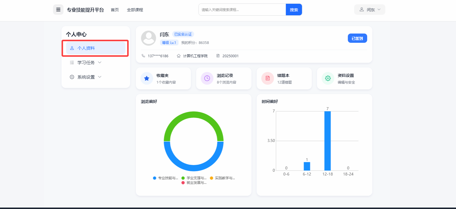 主要呈现个人看板信息内容,包括个人基本信息,浏览偏好、时间偏好等可视化图表。