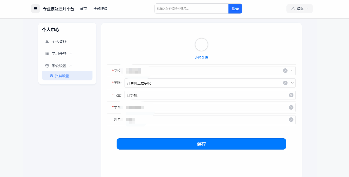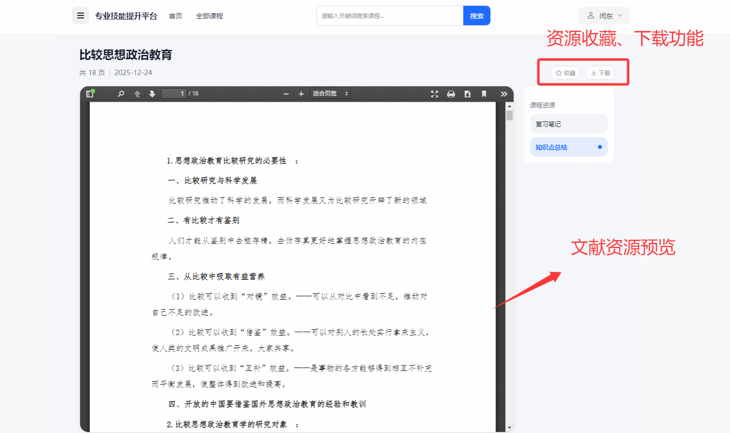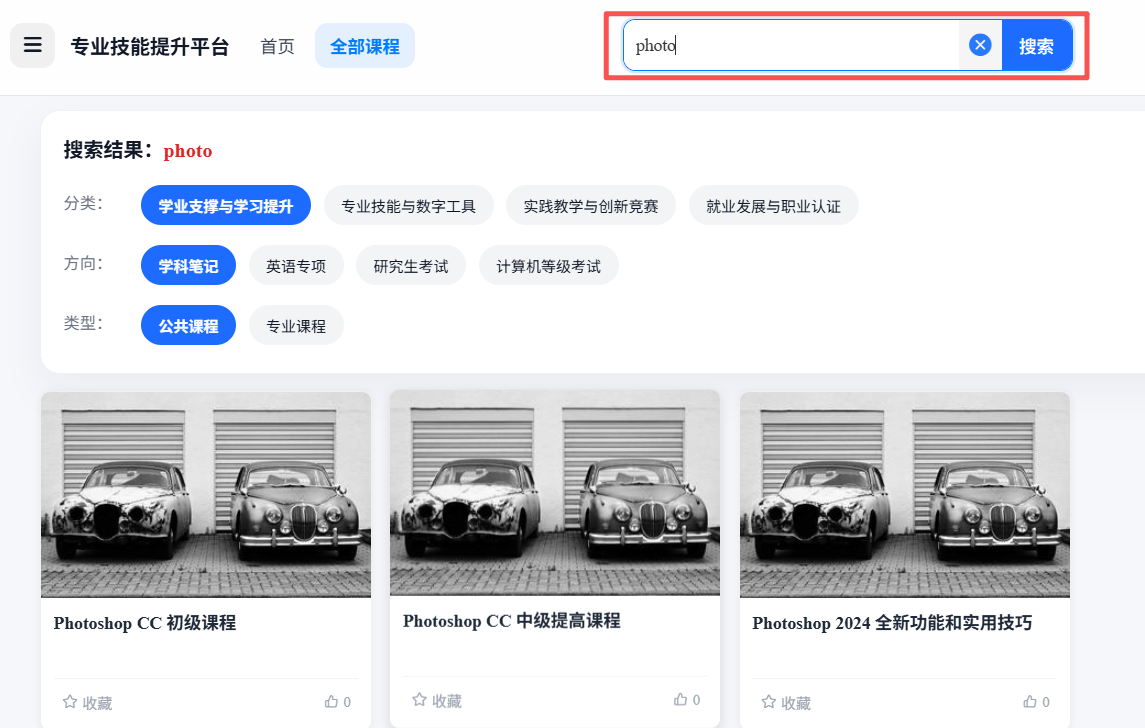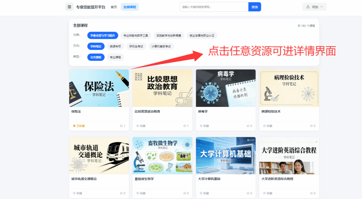 电脑端登陆后,即可进入浏览界面,平台分为四大领域:学业支撑与学习提升、专业技能与数字工具、实践教学与创新竞赛、就业发展与职业认证,选择不同领域,展现相应领域资源。