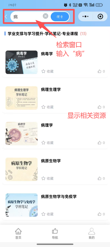 在检索窗口输入要检索的内容,点选“搜索”,即可显示相关课程、资源。